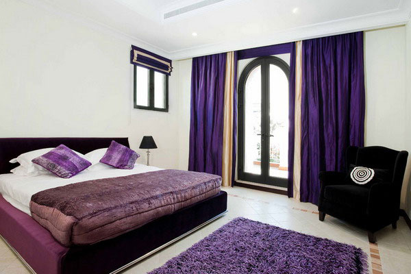 Nhắc tới màu tím thì chắc chắn ai cũng sẽ nghĩ tới sự mộng mơ, chung thủy. Sắc tím mộng mơ kết hợp với tường nhà màu trắng cũng là 1 gợi ý hay và nó dành cho những người có hơi hướng sống tình cảm, hướng nội. Đặc biệt là phòng ngủ của những cặp vợ chồng mới cưới bởi màu tím tượng trưng cho tình yêu và sự chung thủy.